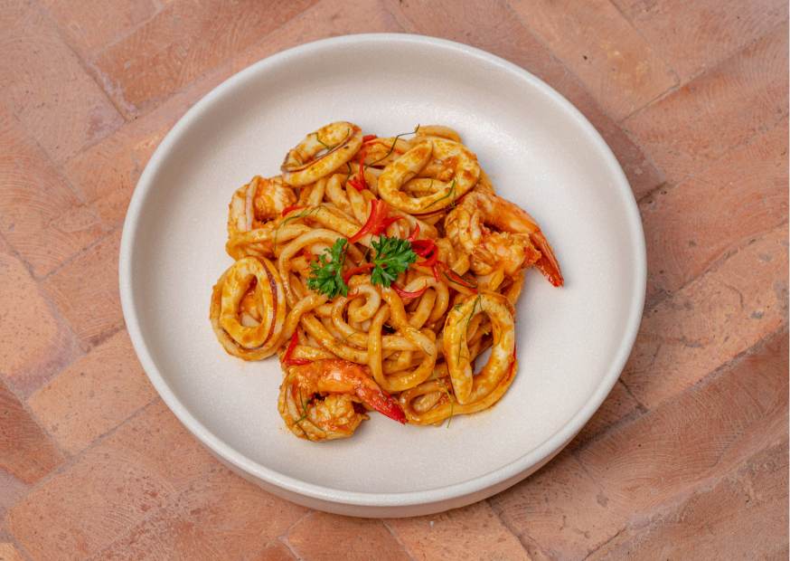 Udon seafood noodles with tomyum sauce